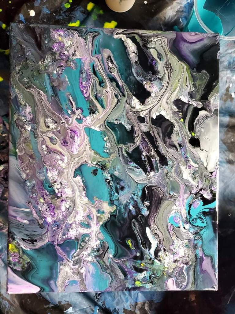 Or 3️⃣ You could also start with a base coat. So let’s say white (you can do any color you want), take your white and poor it on your canvas, then pick up the canvas and move the paint around by tilting it side to side slowly until the entire canvas is covered. Once you’ve done this you can now take your other colors and start slowly drizzling them on top.